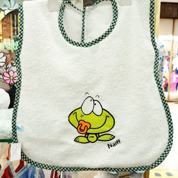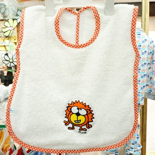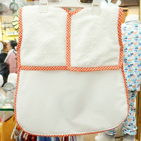 Comilones confeccionados con toalla doble felpa 100% algodón, plástico impermeable y cinta al bies. Contiene abrojo reforzado.