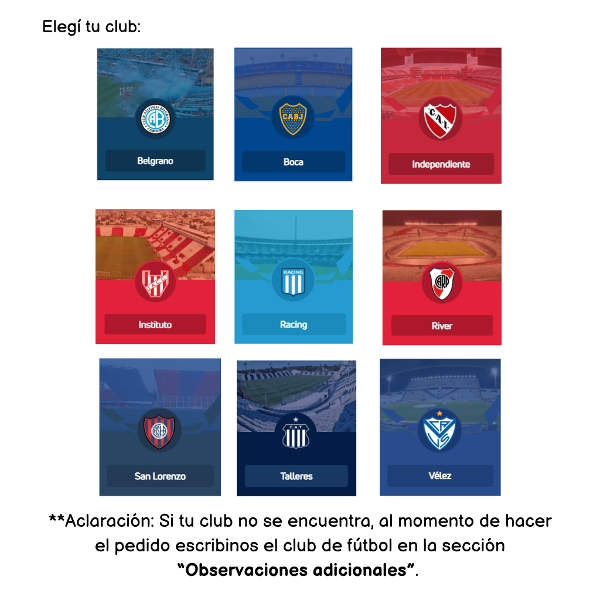 -ACLARACIÓN: Si el club de fútbol no está dentro de las opciones, al momento de hacer el pedido indicar el club deseado en la sección "Observaciones Adicionales".